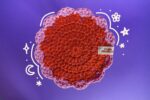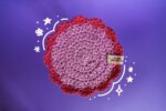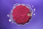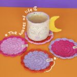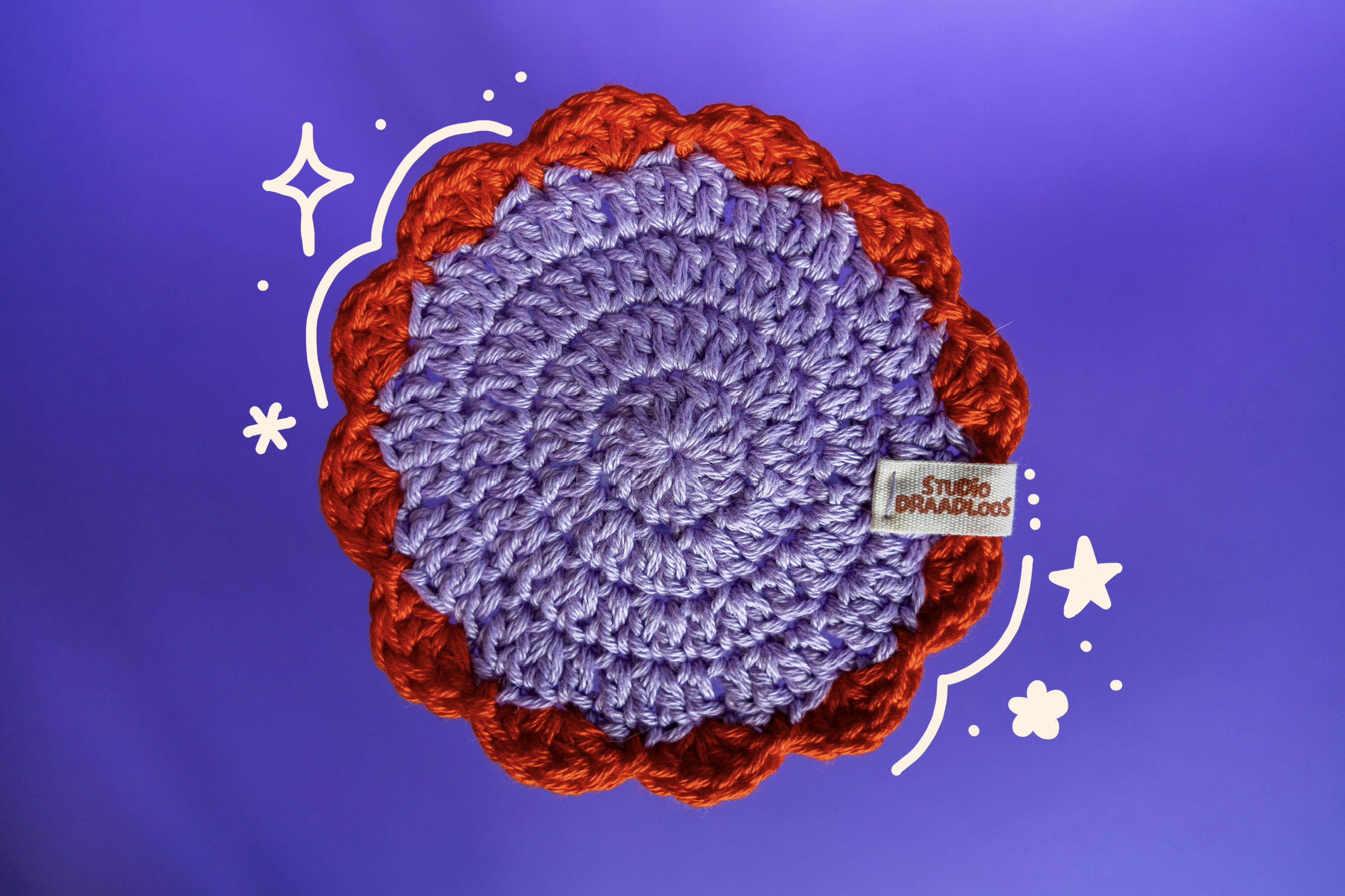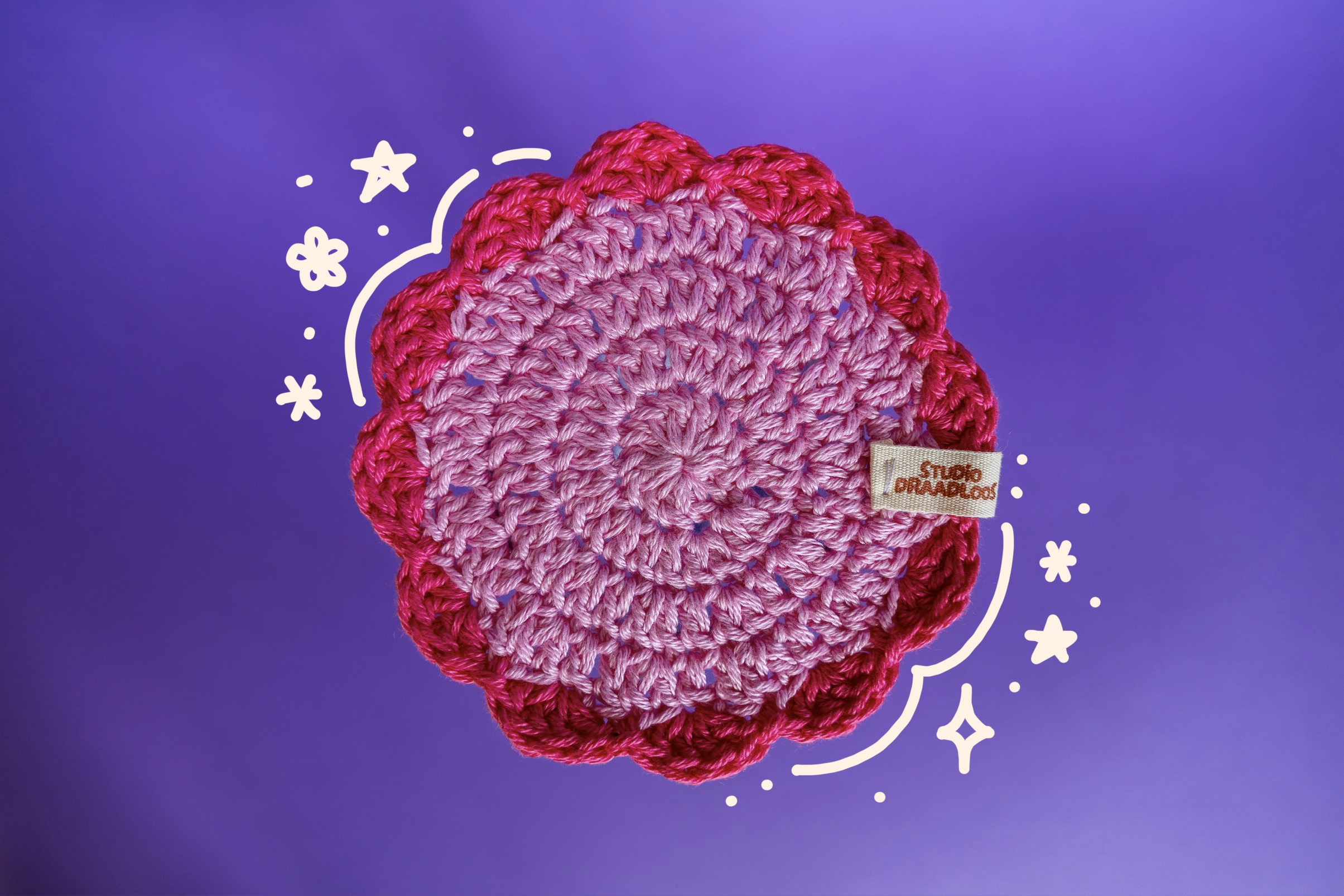 Een set van vier gehaakte onderzetter met een golvend randje in de kleuren (110) Strawberry Red, (610) Cotton Candy Pink, (620) Raspberry Pink en (710) Lavender Purple. Wil je liever andere kleuren? Dat kan! Klik hier om je eigen kleuren te kiezen!